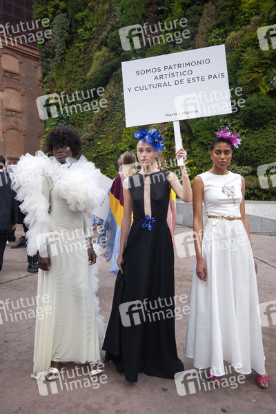 Fashion Show von 10 Modedesignern, die konzipiert wurden, um die charakteristische Mode zu feiern und ihre Rolle in der spanischen Wirtschaft und Kultur zurückzugewinnen auf dem Paseo del Prado. Madrid, 11.04.2021