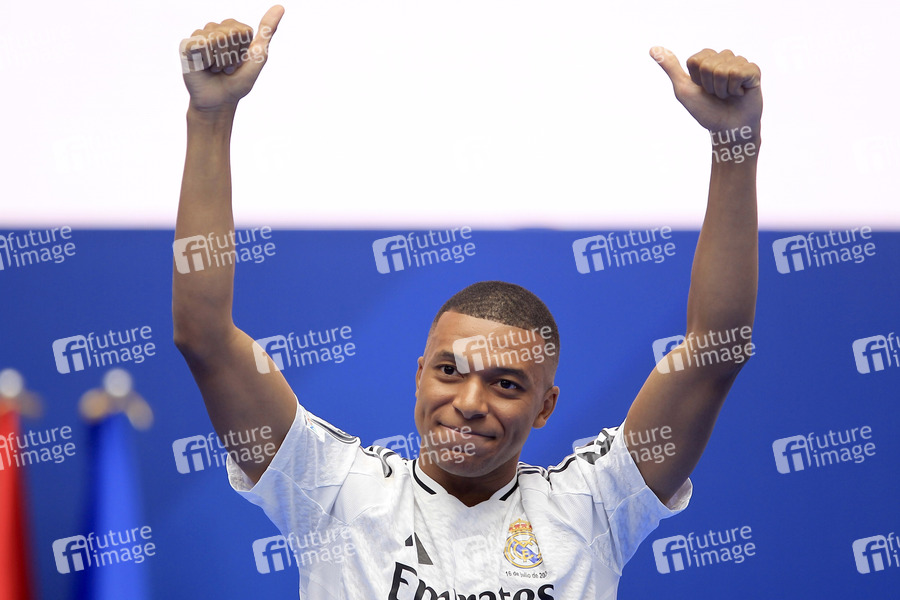 Kylian Mbappe bei der Präsentation als neuer Spieler von Real Madrid im Estadio Santiago Bernabéu. Madrid, 16.07.2024