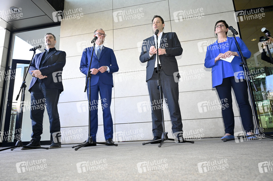 Markus Söder, Friedrich Merz, Lars Klingbeil und Saskia Esken beim gemeinsamen Auftaktstatement der Parteivorsitzenden von CDU, CSU und SPD zur Bildung einer neuen Regierungskoalition im Willy-Brandt-Haus. Berlin, 28.03.2025