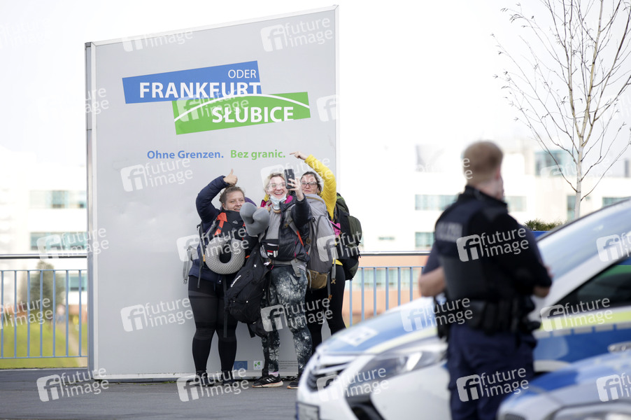Drei Frauen machen ein Selfie vor dem Grenzübergang Frankfurt (Oder) und Slubice. Die Grenzen zwischen Polen und Deutschland sind wegen des Coronavirus geschlossen. Frankfurt (Oder), 16.03.2020