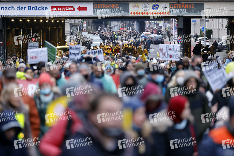 Bei einer angemeldeten Demo demonstrierten etwa 8000 Gegner einer Impfpflicht mit einem Spaziergang gegen die Corona-Maßnahmen der Bundesregierung - darunter auch viele Pflegekräfte, die wegen der Impfpflicht im Gesundheitsbereich ihren Job zu verlieren drohen. Düsseldorf, 15.01.2022