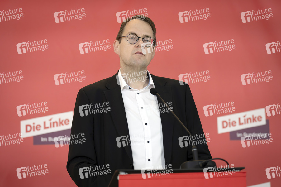 Politik, Statement, Pressekonferenz, PK, Reichstag, Deutscher Bundestag, Demokratie, Parlament, Parlamentsgebäude, Volksvertreter, MdB, Mitglied des Bundestages, Abgeordneter, Politiker, Vorsitzender der Fraktion Die Linke