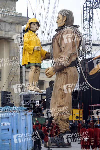 Riesen-Marionetten kommen zum Brandenburger Tor am Tag der Deutschen Einheit in Berlin