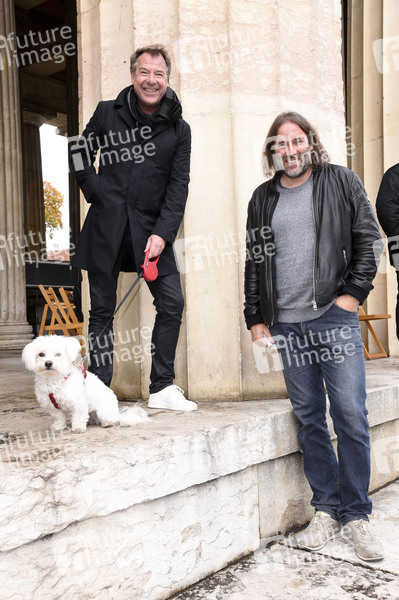 Patrick Lindner mit Hund Obelix und Roland Hefter bei der Kundgebung 'Aufstehen für Kultur' auf dem Königsplatz. München, 24.10.2020