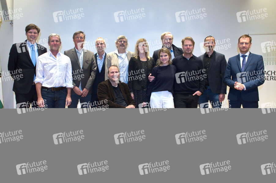 Conrad Clemens, Teresa Weißbach, Lara Mandoki, Stephan Grossmann, Kai Scheve, Michael Kretschmer und Filmteam bei der Preview des ZDF-Krimis 'Erzgebirgskrimi - Der letzte Bissen' in der Vertretung des Freistaates Sachsen. Berlin, 07.10.2021