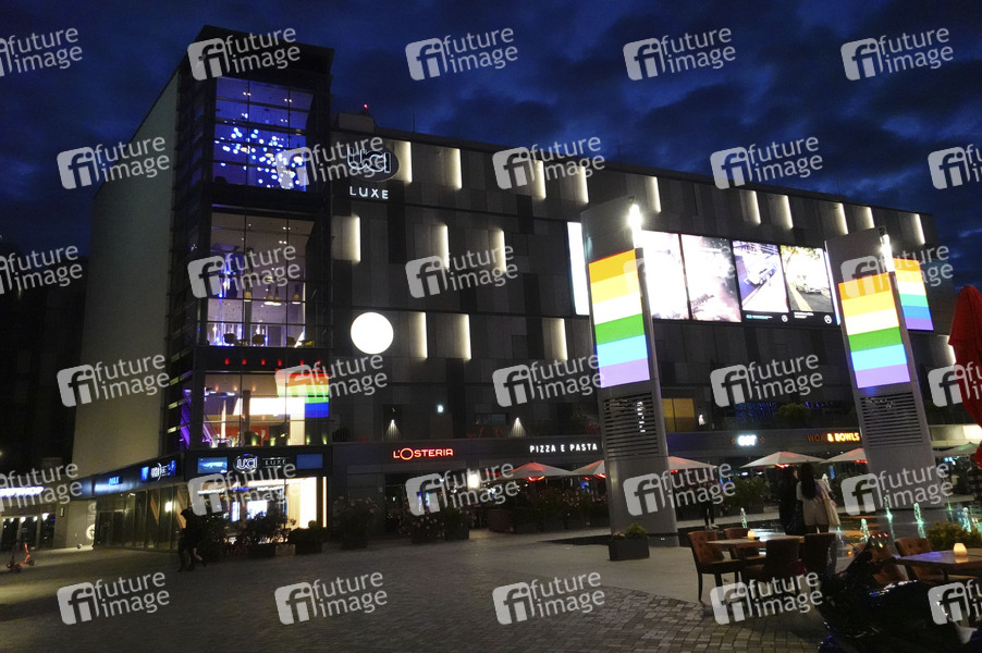 Das Kino UCI Luxe Mercedes Platz leuchtet während des Fußballspiels zwischen Deutschland und Ungarn in den LGBTQ-Farben (Regenbogen). Grund dafür ist die Debatte um das in Ungarn beschlossene LGBTQ-feindliche Gesetz. Berlin, 23.06.2021