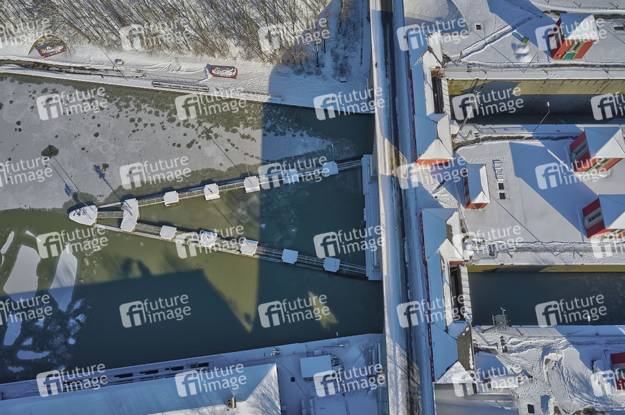 Schleuse Anderten, Wetter, verschneit, Schnee, Glätte, Eis, kalt, Wintereinbruch, Minustemperaturen, Winter, Winterwetter, Grenzwetterlage, Schneefälle, Schneefall, Frost, Wetterlage, Schiffahrt, Binnenschleuse, Kanal, Gewässer, Eisschollen, Drohne, Drohnen, Kameradrohne, Drohnenaufnahme