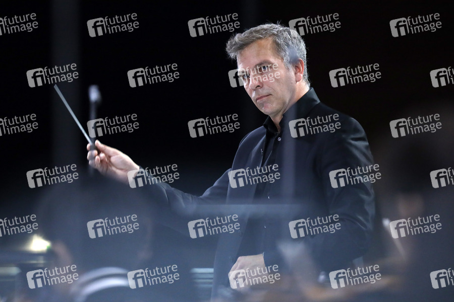 Dirk Kaftan bei der Generalprobe des Beethoven Orchester Bonn für die von einer KI vollendete 10. Sinfonie Beethovens vor der abendlichen Uraufführung im Telekom Forum. Bonn, 09.10.2021