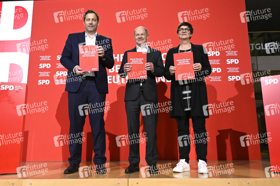 Lars Klingbeil, Olaf Scholz und Saskia Esken bei der Pressekonferenz zum Beschluss des SPD-Wahlprogramms für die Bundestagswahl 2025 im Willy-Brandt-Haus. Berlin, 17.12.2024