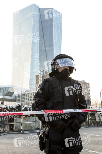 Die kapitalismuskritische Blockupy-Bewegung hat zu einem Protesttag gegen die europäische Krisenpolitik aufgerufen. Anlass ist der Festakt zur Eröffnung der neuen Zentrale der Europäischen Zentralbank (EZB). Es kommt zu Ausschreitungen und Angriffe auf Polizisten. Demonstranten versuchen, das weiträumig abgesperrte Gelände der EZB zu stürmen, werden aber von der Polizei gestoppt. Frankfurt am Main, 18.03.2015