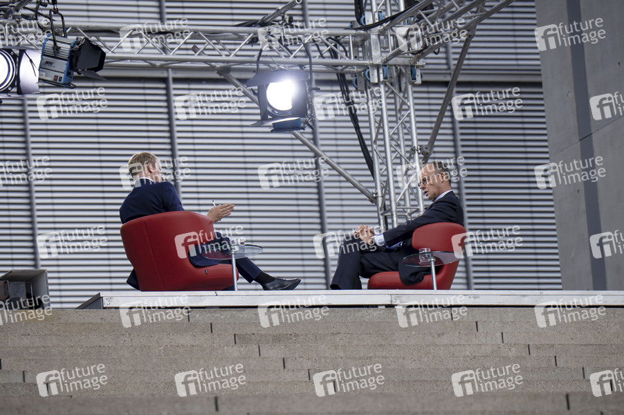 Markus Preiß und Friedrich Merz beim ARD-Sommerinterview auf der Terrasse vom Marie-Elisabeth-Lüders-Haus. Berlin, 13.07.2025