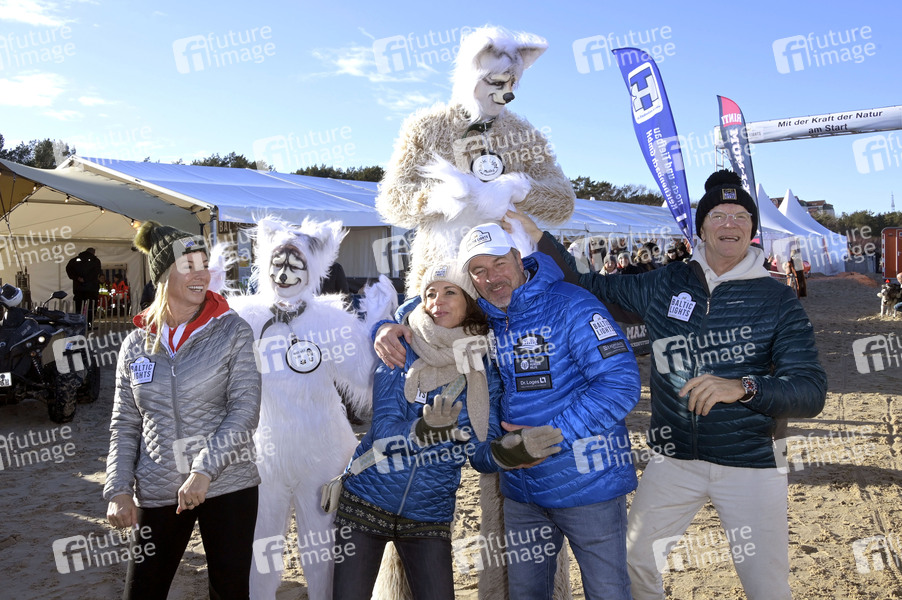 Gesine Lippert, Claudia Jungesbluth, Gerit Kling, Enrico Lein, Till Demtröder und Wolfgang Lippert beim Baltic Lights 2023 Charity-Hunderennen zu Gunsten der Welthungerhilfe zwischen der Seebrücke Ahlbeck und der Seebrücke Heringsdorf. Heringsdorf, 04.03.2023