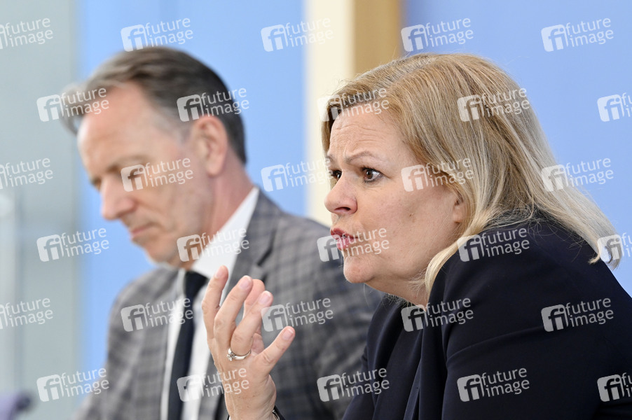 Holger Münch und Nancy Faeser bei der Bundespressekonferenz zu den Fallzahlen für die Politisch Motivierte Kriminalität (PMK) 2023 im Haus der Bundespressekonferenz. Berlin, 21.05.2024