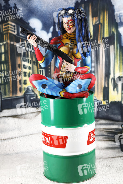 Farbkörper, Bodypainting, Body-Painting, Cosplay, Cosplayer, Frau, Mädchen, nackt, Akt, weiblich, Körperkunst, Körperfarben, Farbe, Bemalung, Kunst, Malerei, Science Fiction, Sci-Fi, SciFi, Fantastic, Comic Art, Anime, Studio, Comic-Helden, Comics, Marvel, DC, Superheldin, Superhelden-Fan, Waffe, Gewehr, Pumpgun, Ölfass, body painting, erotic, woman, girl, nude, female, body art, indoors, colors, superheroes, heroe, villain, pump-gun, oil barrel