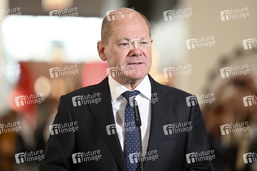 Olaf Scholz beim Pressestatement nach dem Eröffnungsrundgang auf der Hannover Messe 2022 auf dem Messegelände. Hannover, 30.05.2022