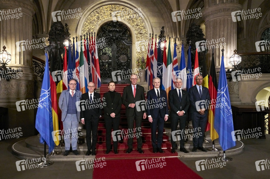 Bart De Wever (Premierminister von Belgien), Luc Frieden (Premierminister von Luxemburg), Mette Frederiksen (Ministerpräsidentin von Dänemark), Friedrich Merz (Bundeskanzler von Deutschland), Jonas Gahr Store (Ministerpräsident von Norwegen), Dick Schoof (Ministerpräsident der Niederlande), und Jean-Charles Ellermann-Kingombe (Stellvertretender Generalsekretär für Cyber- und Digitale Transformation der NATO) beim Treffen der Regierungschefs zum 3. internationalen Nordsee-Gipfel 2026 im Rathaus. Ziel des Gipfels ist es, den grenzüberschreitenden Ausbau der Offshore-Windenergie, den Wasserstoffmarkt und zugleich eine leistungsfähige und vernetzte Offshore-Infrastruktur im gesamten Nordseeraum weiter voranzutreiben. Hamburg, 26.01.2026