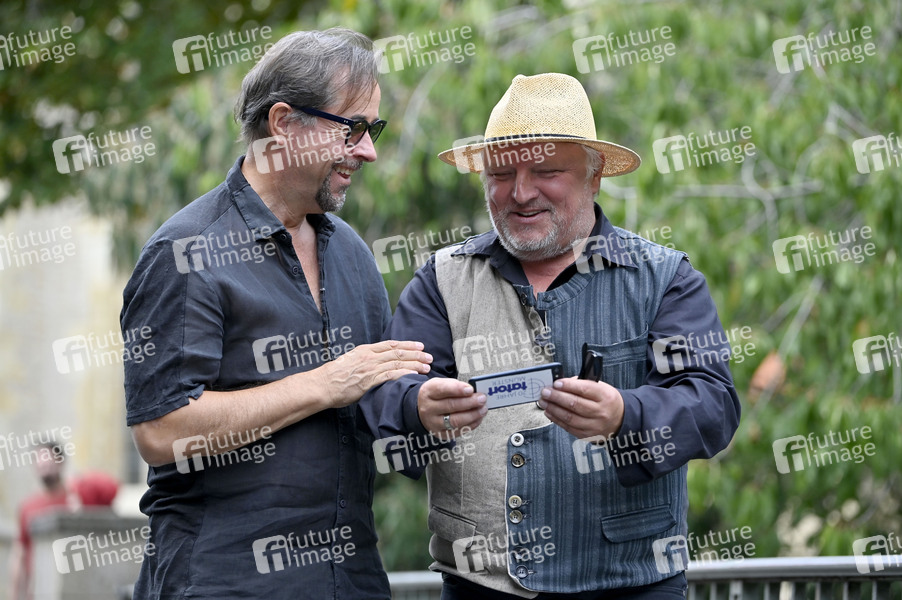 Jan Josef Liefers und Axel Prahl beim Presserundgang 'Spurensuche Tatort Münster' an original Drehorten mit dem Tatort-Cast zum 20 jährigen Jubiläum des Münsteraner Tatorts. Münster, 30.08.2022