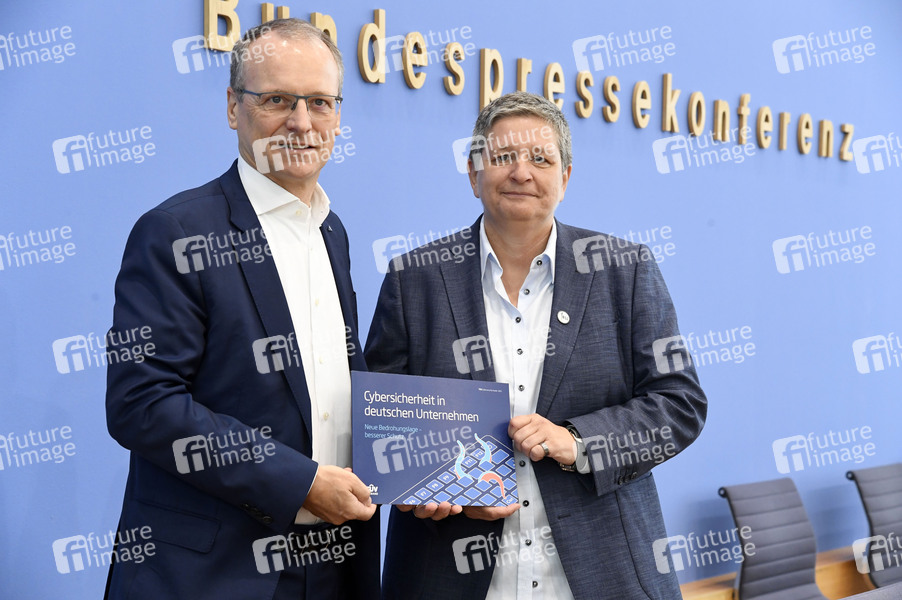 Michael Fübi und Claudia Plattner bei der Bundespressekonferenz 'Cybersecurity: Studie zur digitalen Sicherheit der deutschen Wirtschaft vor dem Hintergrund globaler Krisen' im Haus der Bundespressekonferenz. Berlin, 11.06.2025