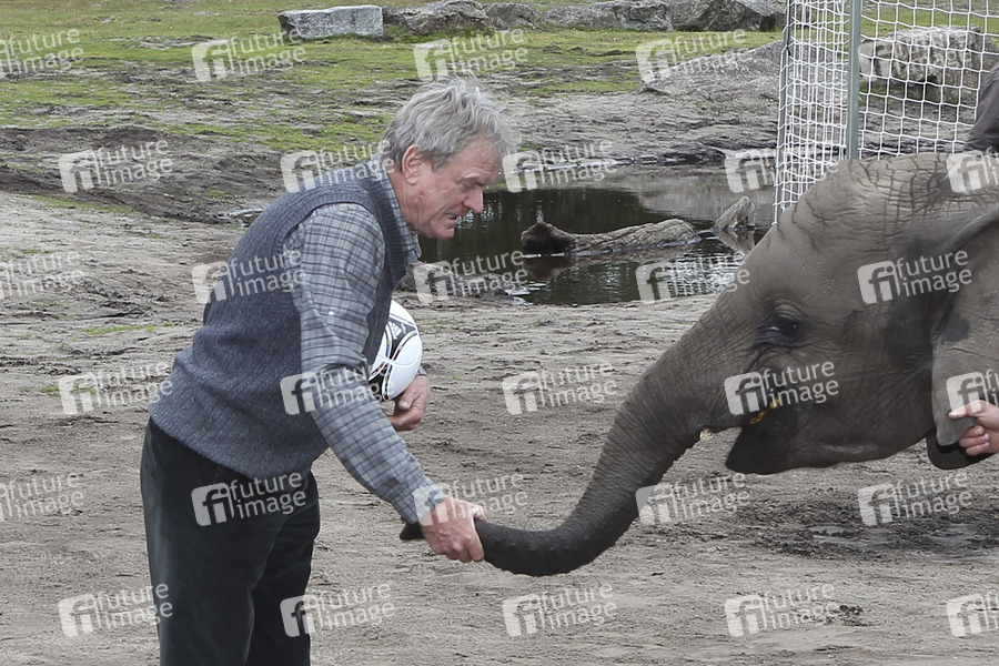 Start der Fan Fun Runde mit Elefantendame Nelly im Serengeti-Park, Hodenhagen. Gemeinsam mit Sepp Maier tippte Sie heute für das erste Spiel der deutschen Fußballnationalmannschaft gegen Portugal
