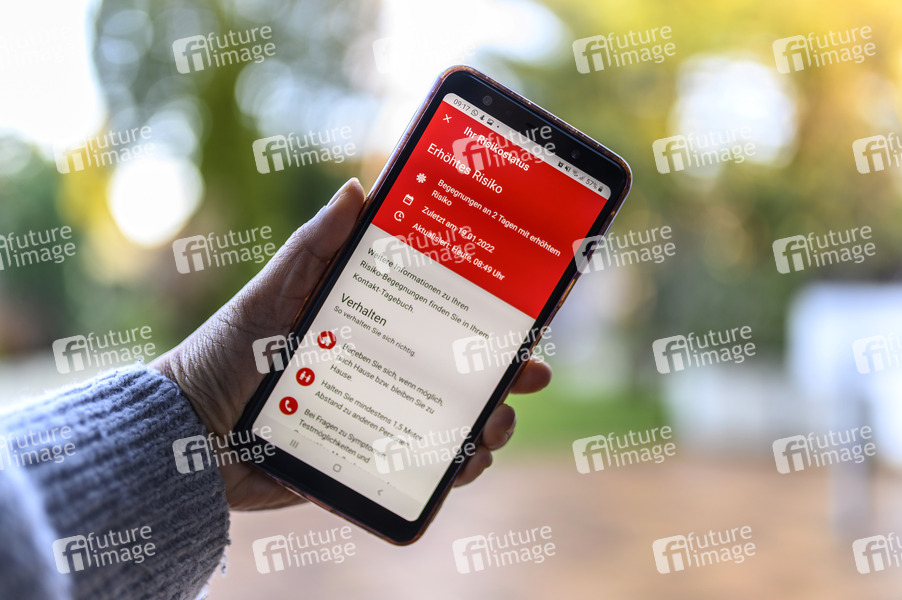 Die Corona-Warn-App zeigt auf einem Handy den Status 'erhöhtes Risiko' aufgrund möglicher Begegnungen mit positiven Kontaktpersonen an. (Themenbild, Symbolbild) Frechen, 24.01.2022