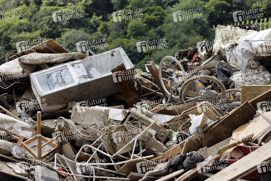 Nach dem Jahrhunderthochwasser in der Eifel durch heftige Regenfälle und Dauerregen mit Überschwemmungen und Überflutungen haben die Aufräumarbeiten im Ahrtal begonnen. Einheiten von Polizei, THW, Bundeswehr und Feuerwehr mitsamt vielen freiwilligen Helfern räumen Straßen, entfernen Schutt und Schlamm und versorgen die Menschen. Im Bild eine improvisierte Müllkippe mit Flutmüll bei der Ortschaft Dernau, in der die Flut viele Häuser zerstörte, 22.07.2021