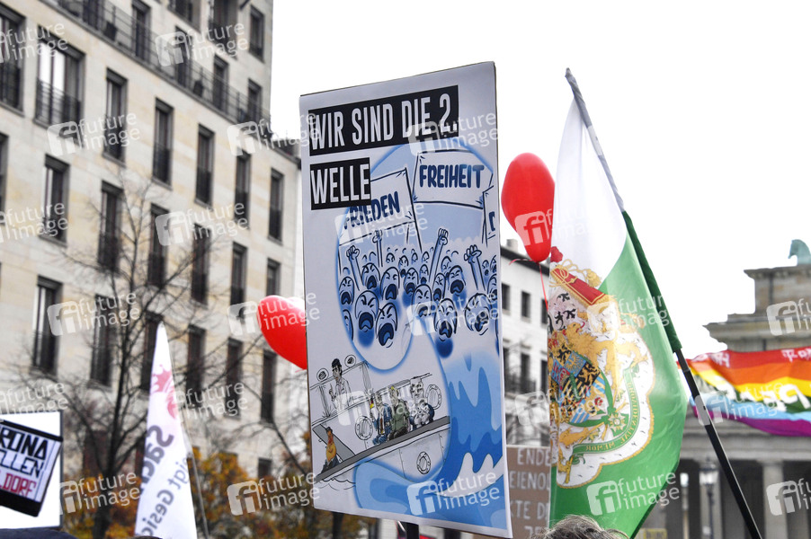 Tausende Demonstranten protestieren am Brandenburger Tor und im Regierungsviertel gegen die Corona-Politik der Regierung. Wegen der massenhaften Verstöße gegen die Hygieneauflagen droht die Polizei mit Auflösung der Versammlung. Das Gelände vor dem Bundestag ist abgesperrt, dort sind Proteste verboten. Berlin, 18.11.2020