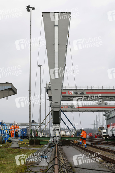 Portalkran beim Fototermin 'DB montiert 400 Tonnen schwere neue Krananlage' im DUSS-Terminal Köln-Eifeltor. Köln, 23.01.2025