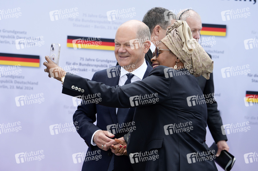 Olaf Scholz beim Staatsakt zu 75 Jahre Grundgesetz auf dem Forum zwischen Bundestag und Kanzleramt. Berlin, 23.05.2024