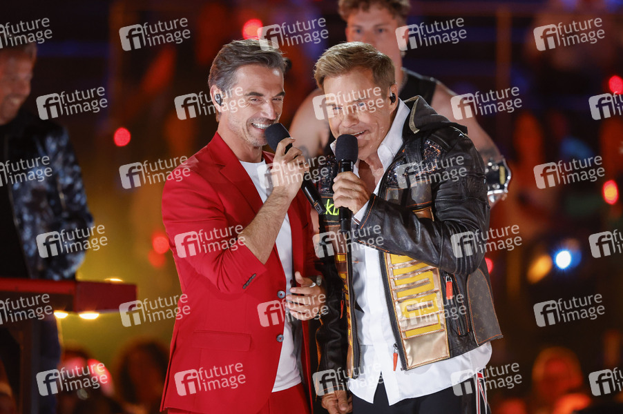 Florian Silbereisen und Dieter Bohlen in der TV-Show 'Schlagerbooom Open Air 2025 - Die Berge leuchten!' live aus dem Stadion Kitzbühel. Kitzbühel, 21.06.2025