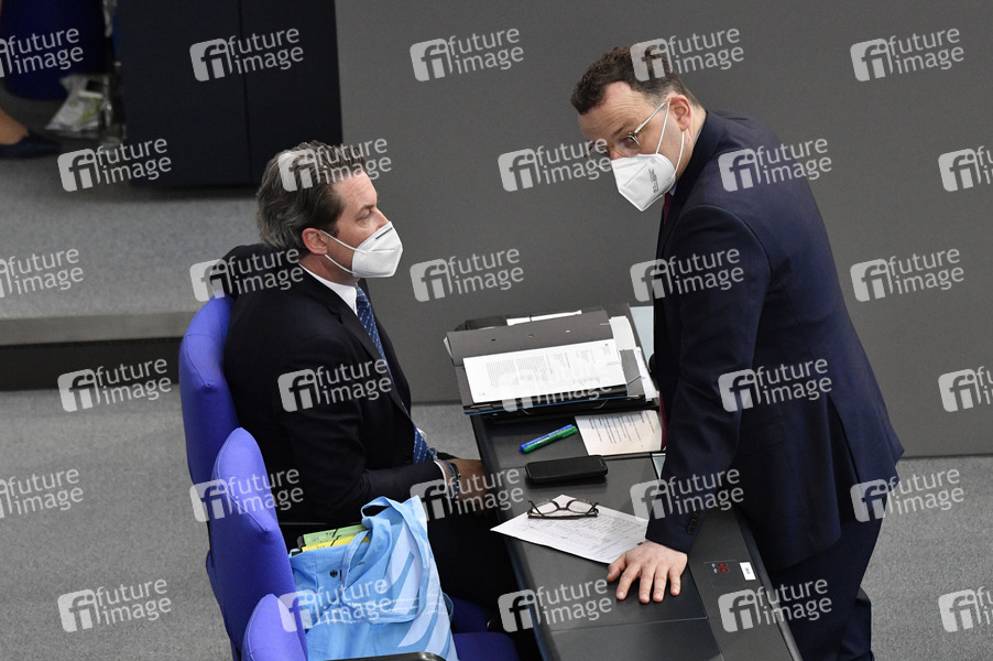 Andreas Scheuer und Jens Spahn in der 216. Sitzung des Deutschen Bundestages im Reichstagsgebäude. Berlin, 05.03.2021