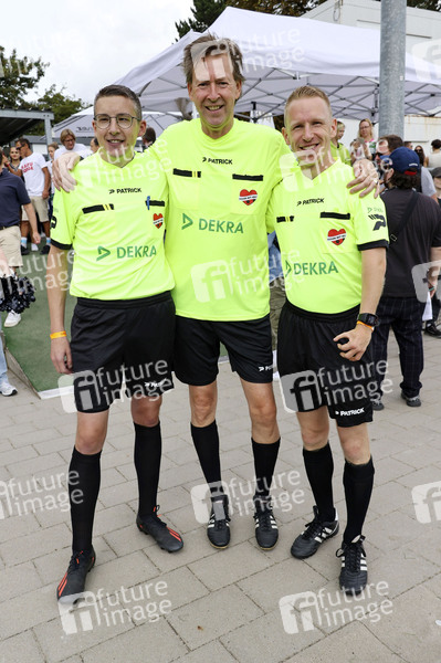 Das Schiedsrichterteam mit Lou Richter beim Benefiz-Fußballspiel 'Kicken mit Herz' 2023 zu Gunsten des Herzzentrums des UKE im Stadiun Hoheluft. Hamburg, 03.09.2023