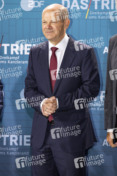 Olaf Scholz beim 'Triell - Dreikampf ums Kanzleramt' von ARD und ZDF mit den Kanzlerkandidaten im Studio Berlin-Adlershof. Berlin, 12.09.2021