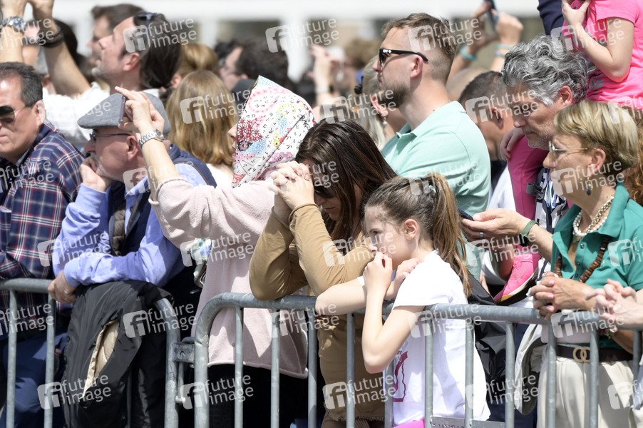 Trauernde Menschen nach dem Tod von Papst Franziskus auf dem Petersplatz. Rom, 21.04.2025