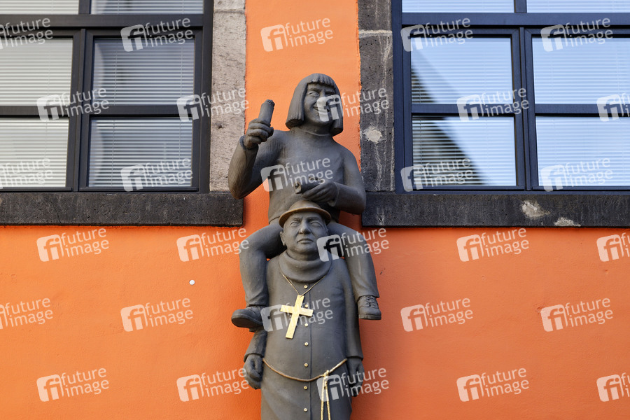 An der Brauerei zum Pfaffen ist eine Skulptur, die einen Betrunkenen auf den Schultern eines Priesters zeigt. Das spätere Haus Heumarkt 62 wurde bereits Anno 1176 auf römischen Fundamenten erbaut, es lag auf einer kleinen dem Rhein vorgelagerten Insel. 1973 wurde das Haus saniert und seiner heutigen Nutzung als Brauereiausschank zugeführt. (Themenbild, Symbolbild) Köln, 09.04.2021
