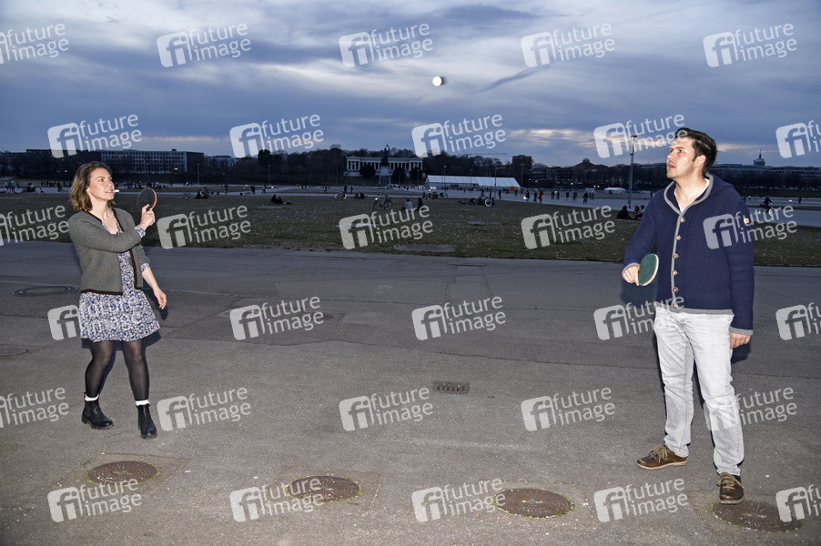 Christina Schmideder und Max Kronseder (DeSchoWieda) beim Videodreh zum Lied 'Radlg'fahrn und G'schmissn' der Guten A-Band im Bavariapark und auf der Theresienwiese. München, 26.03.2021