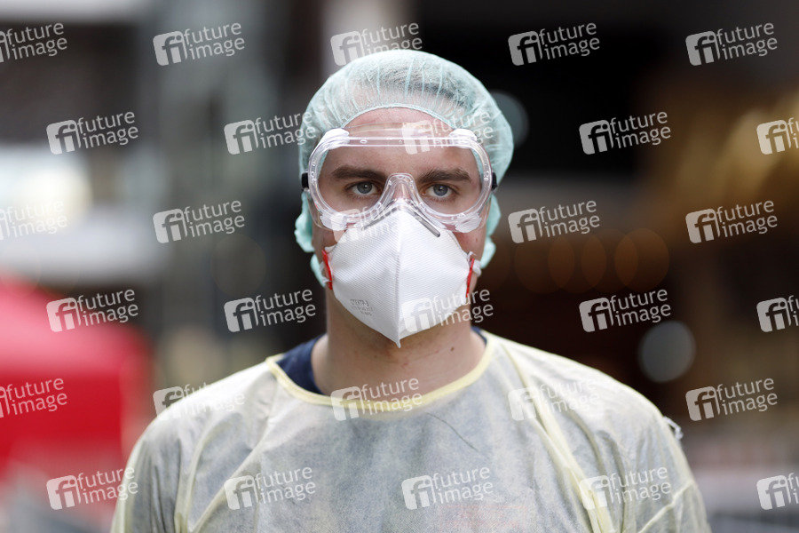 Die Stadt Köln hat ein drittes Infektionsschutzzentrum mit Mitarbeitern der Kölner Feuerwehr in Betrieb genommen, wo sich Bürger auf Covid-19 testen lassen können. Köln, 01.04.2020
