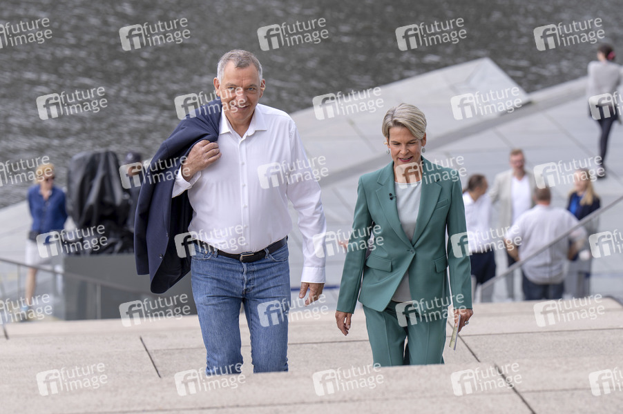 Jan van Aken und Anna Engelke beim ARD-Sommerinterview auf der Terrasse vom Marie-Elisabeth-Lüders-Haus. Berlin, 17.08.2025