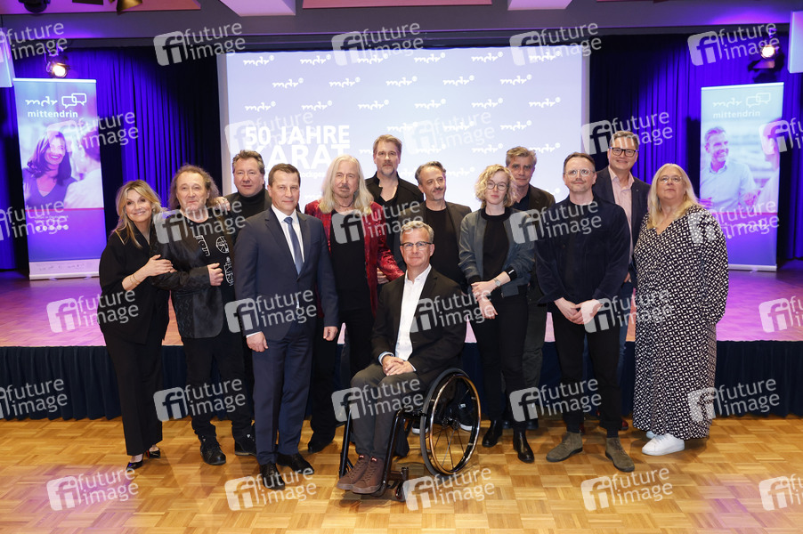 Kim Fisher, Martin Becker, Claudius Dreilich, Ralf Ludwig, Bernd Römer, Daniel Bätge, Olaf Jacobs, Heiko Jung, Uta Bretschneider, Lutz Pehnert, Denny Niesar, Andreas Fritsch und Jana Brandt bei der Preview der MDR-Dokumentation '50 Jahre Karat' im Zeitgeschichtlichen Forum. Leipzig, 25.03.2025