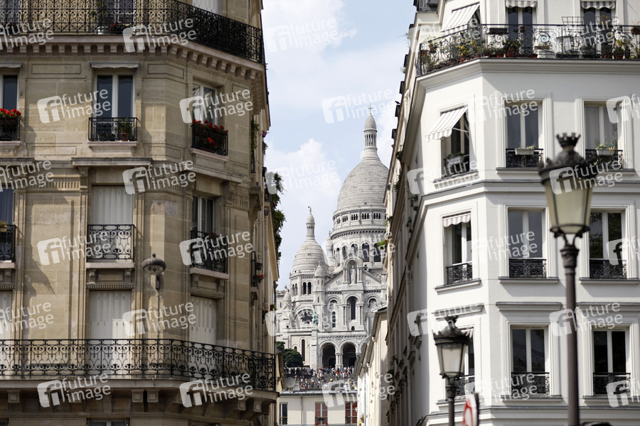 Tourismus, Touristen, Sightseeing, Stadt der Liebe, neobyzantinischer Bau, Architektur, Sommer in Paris, Reiseziel, Frankreich, Kultur, Sacre Coeur, Basilika, Straßenschlucht, Impression, Stadtleben, Stadtbild