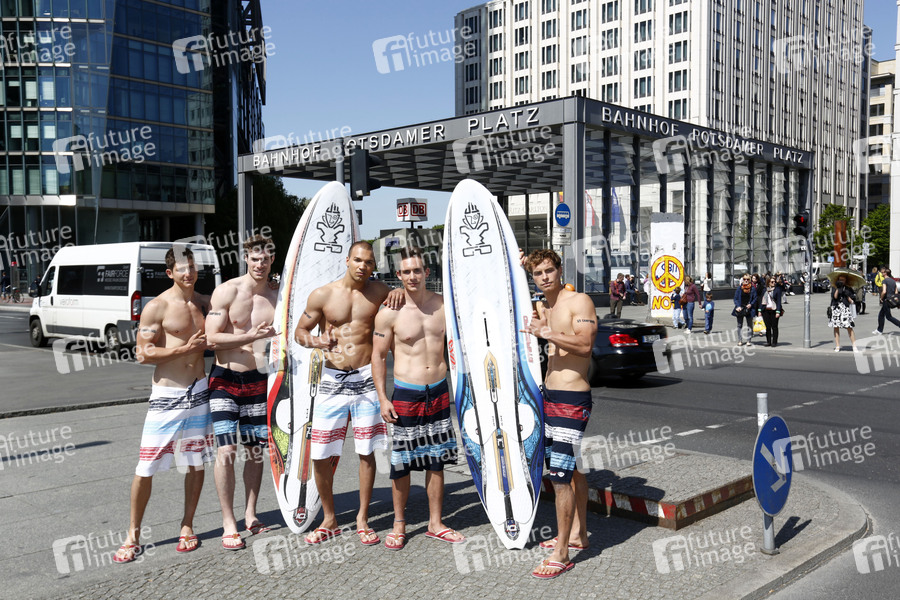 Open Air-Fashionshow des Menswear-Labels Camp David mit Surfern in sexy Beachwear der 'Special Collection Björn Dunkerbeck by Camp David' am Potsdamer Platz. Berlin, 28.04.2014