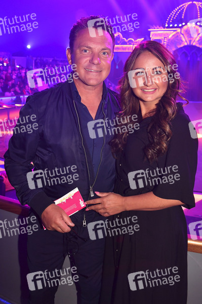 Stefan Mross mit Partnerin Eva Luginger bei der Premiere des Circus Krone Tourneeprogramms 'Farbenspiel - Gold Edition' im Circus Krone Zelt auf der Theresienwiese. München, 10.04.2025