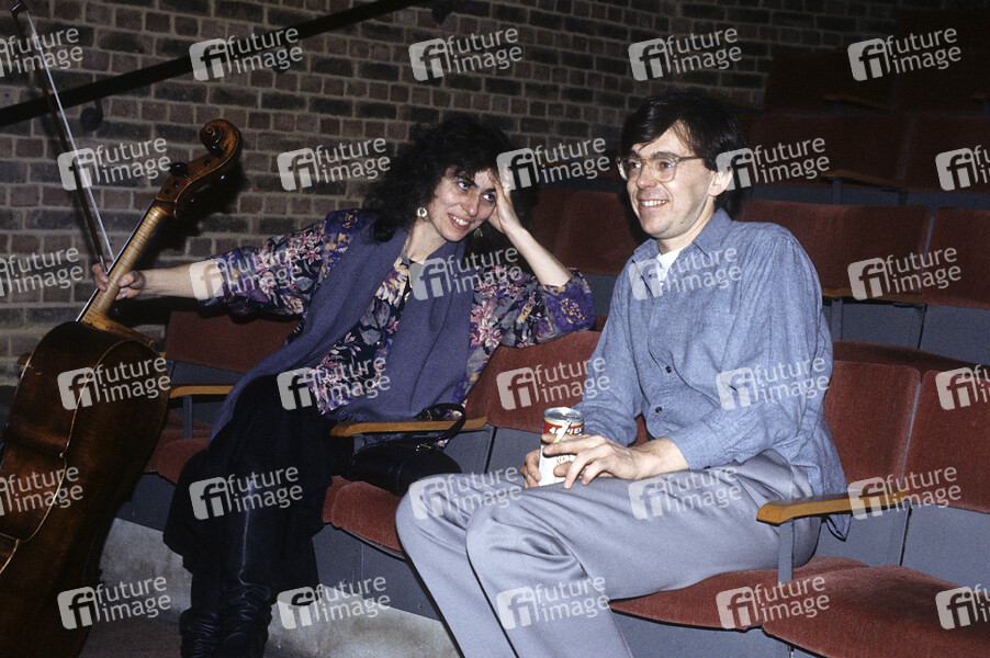 Helen Liebmann und Simon Jeffes vom Penguin Cafe Orchestra beim Soundcheck im Mermaid Theatre. London, 16.12.1984