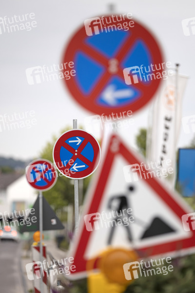 Mit Verkehrsschildern ausgewiesene Halteverbotszone in einem Industriegebiet. Bonn, 12.06.2020