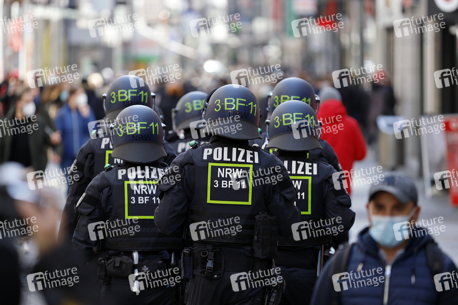 Am Rande einer unangemeldete Demo von Kritikern der Corona-Maßnahmen vor dem Kölner Dom führten Polizei und Ordnungsamt zahlreiche Kontrollen auf Einhaltung der Corona-Maßnahmen wie Mindestabstand und Maskenpflicht durch. Ab Montag will NRW wegen der steigenden Inzidenzzahlen noch strengere Corona-Regeln anwenden. Im Bild eine Einheit der Polizei, die eine Gruppe Corona-Demonstranten ohne Masken durch die Innenstadt verfolgt. Köln, 27.03.2021