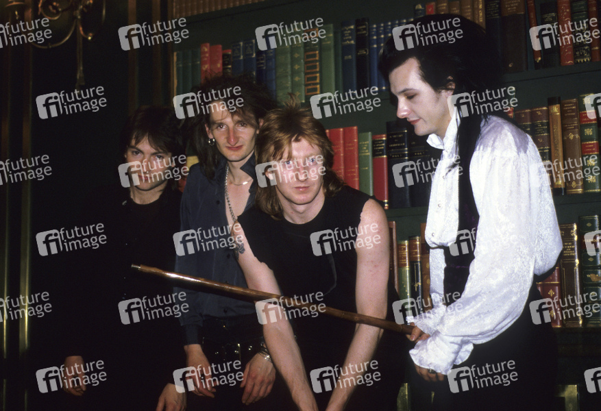 Roman Jugg, Bryn Merrick, Rat Scabies und Dave Vanian von The Damned bei einem Photoshooting in einem Hotel. London, 12.07.1985