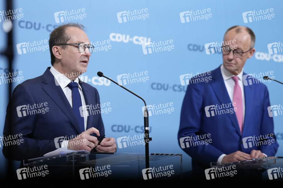 Alexander Dobrindt und Friedrich Merz beim Pressestatement zur Fraktionssitzung der CDU/CSU-Bundestagsfraktion im Reichstagsgebäude. Berlin, 17.12.2024
