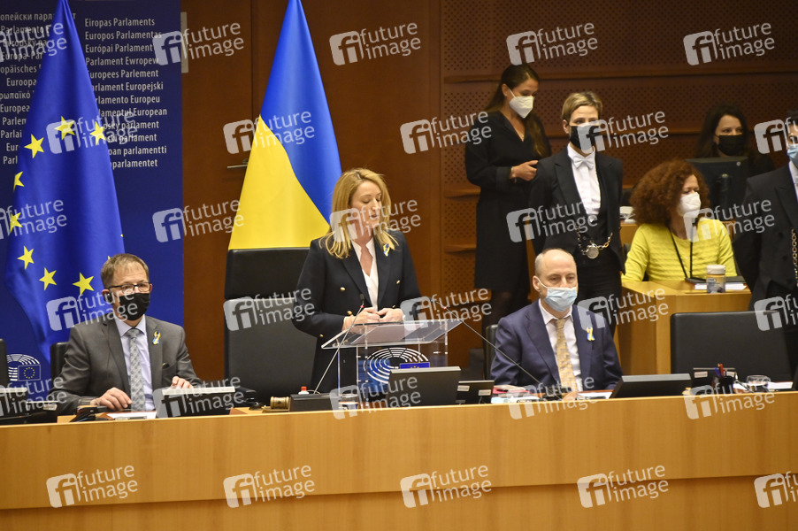 Rede, Politik, Europaparlament, EU-Parlament, EP, Parlament der Europäischen Union, Parlamentum Europaeum, MdEP, Mitglied des Europäischen Parlaments, Krieg, Angriffskrieg, Einmarsch, Europapolitik, internationale Krise, internationale Politik, internationales Recht, Konflikt, Krieg, Kriegsbeginn, Kriegsverbrechen, Krise, Militäroffensive, Militärschlag, Sanktionen, Solidarität, Solidaritätsbekundung, Ukraine, Ukrainekonflikt, Ukraine-Konflikt, Ukrainekrise, Ukraine-Russland-Krise, Politikerin, Malta, Partit Nazzjonalista, EU-Parlamentspräsidentin, Präsidentin des EU-Parlaments