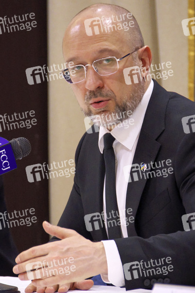 Der ukrainische Ministerpräsident Denys Shmyhal / Denys Schmyhal bei einer Pressekonferenz im Foreign Correspondents' Club of Japan. Er ist auf einem diplomatischen Besuch in Japan, um angesichts der zögernden US-Unterstützung bezüglich Waffenlieferungen anderweitig für Unterstützung im Krieg gegen Russland zu werben. Tokio, 20.02.2024