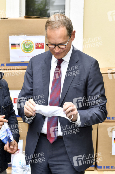 Michael Müller bei der Entgegennahme der Spende von Masken und Handschuhen des vietnamesischen Wohltätigkeitsvereins Hoi tu thien Sen Vang Berlin in Pankow. Berlin, 25.05.2020