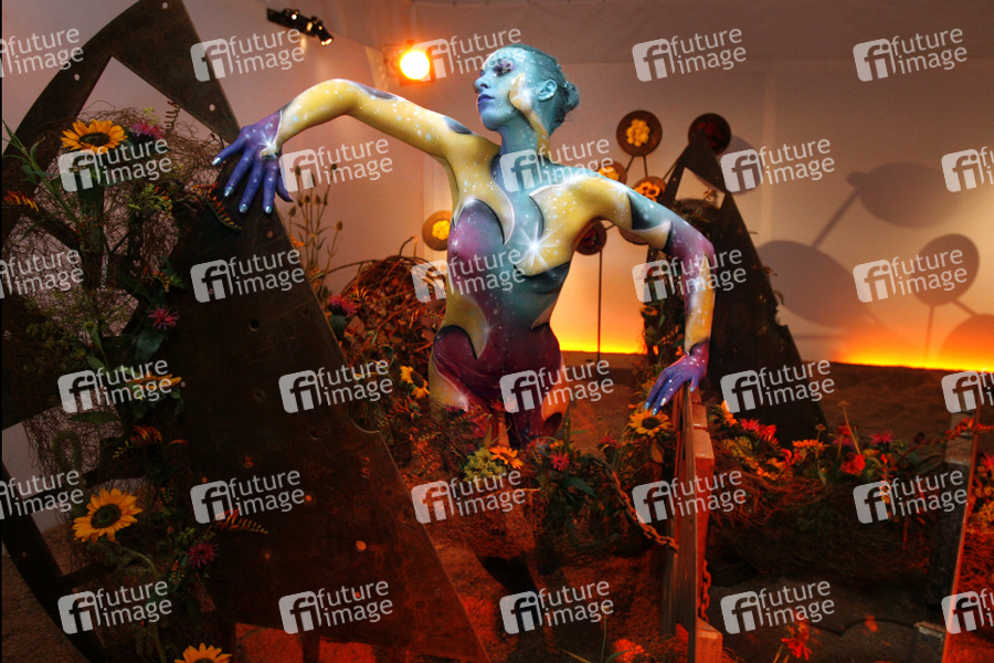Bodypainting und Fotoshooting mit Model Sarah am Tag der offenen Tür der Meisterschule Justus-von-Liebig-Schule, Abteilung Floristik in Hannover-Ahlem. Künstler: Jörg Düsterwald